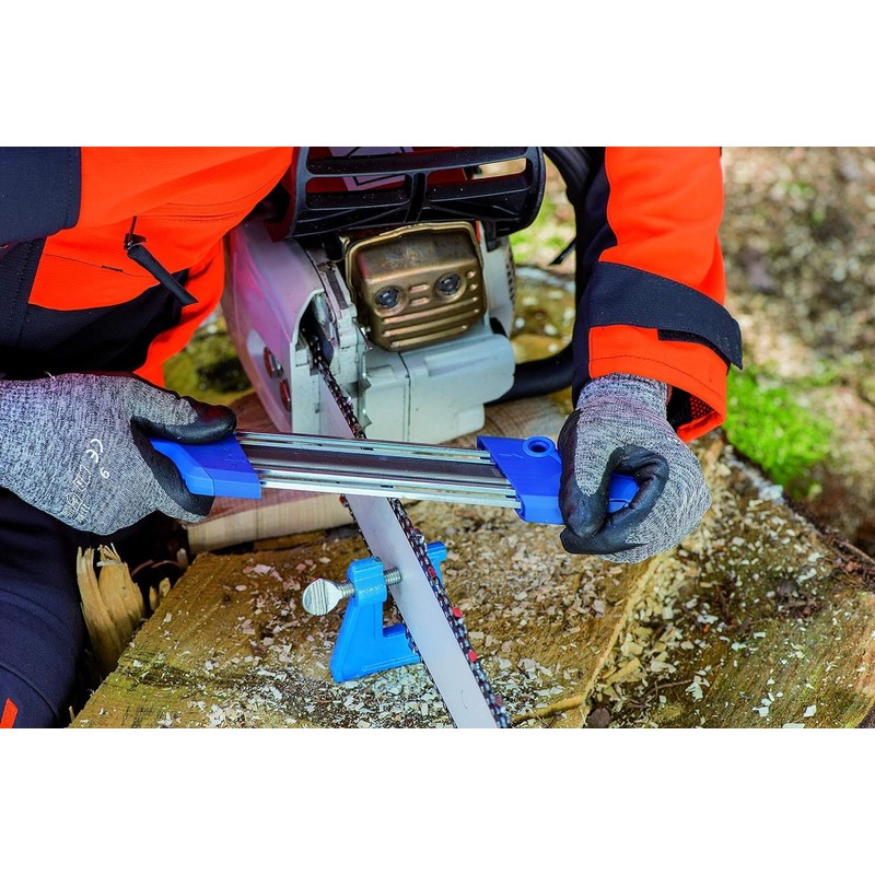 - The portable file vise is characterised by optimal attachment to the guide rail in the forest and it prevents the chainsaw from slipping