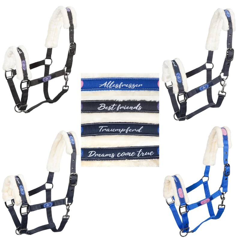 - The halter is adjustable in two ways (on headpiece and noseband) and has small details of printed logos and sayings or pet names.