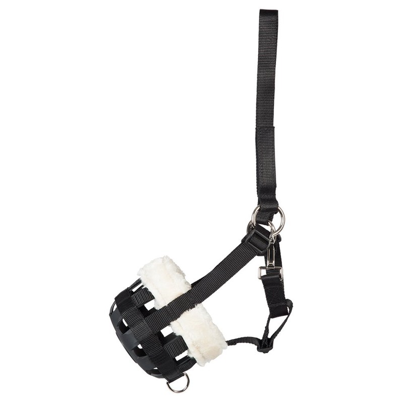- The muzzle is equipped with faux fur at the top to protect the horse's sensitive mouth from chafing