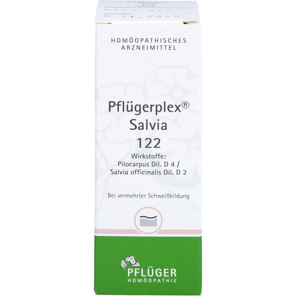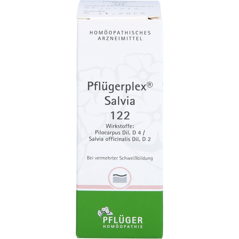 PFLÜGERPLEX Salvia 122. Areas of application: the areas of application are derived from the homeopathic pharmaceutical images. This includes: increased sweating. Warning: contains 52% alcohol.