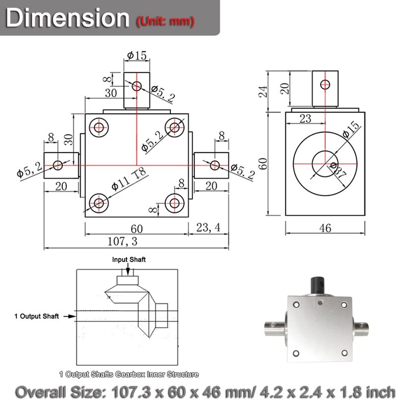 - Material: Aluminum alloy & #45 Steel, the input and output shafts take the blackening or galvanizing process (random), Overall Size: 107.3 x 60 x 46 mm/ 4.2 x 2.4 x 1.8 inch.