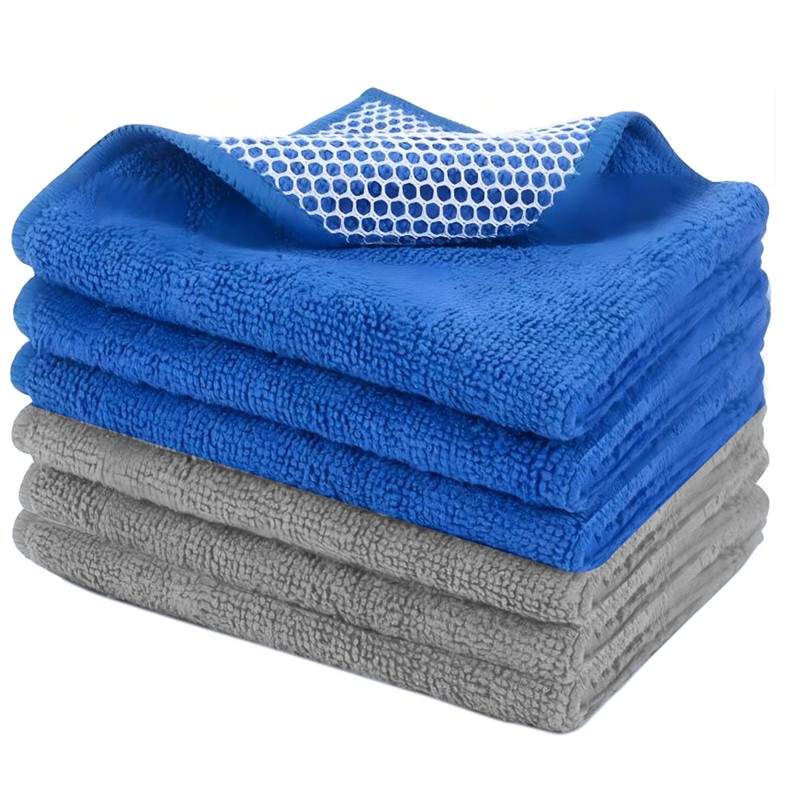 PGlife Microfiber Dish Cloth with Poly Mesh Scouring Side for Kitchen Cleaning and Housekeeping,30cm X30cm, 6pack,Blue+Grey