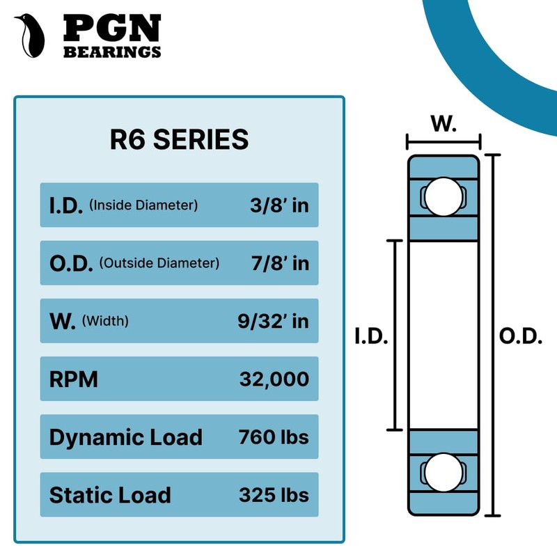 PGN (10 Pack) R6-2RS Bearing - Lubricated Chrome Steel Sealed Ball Bearing - 3/8"x7/8"x9/32" Bearings with Rubber Seal & High RPM Support