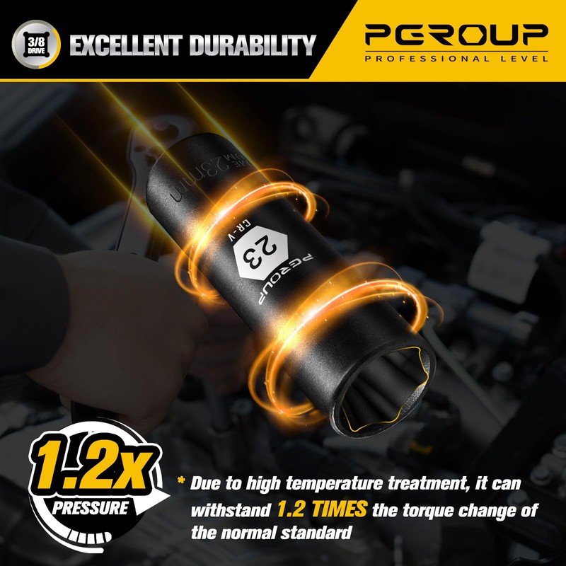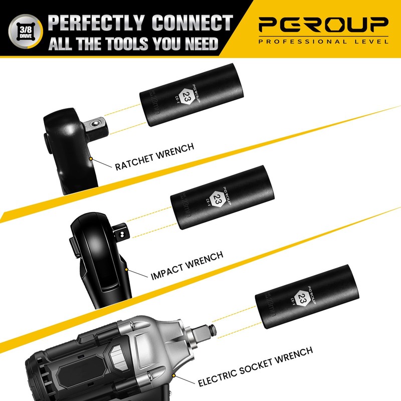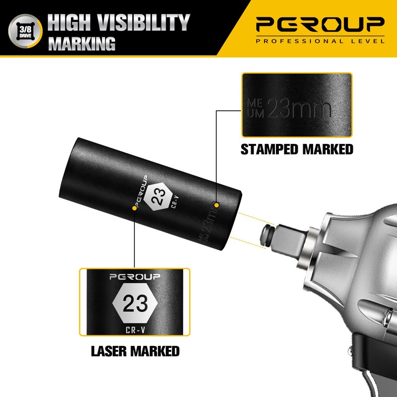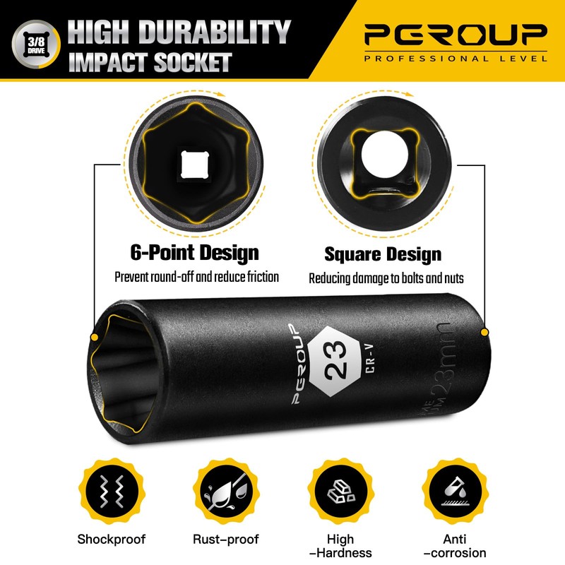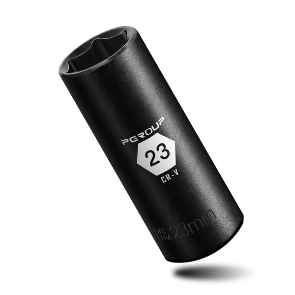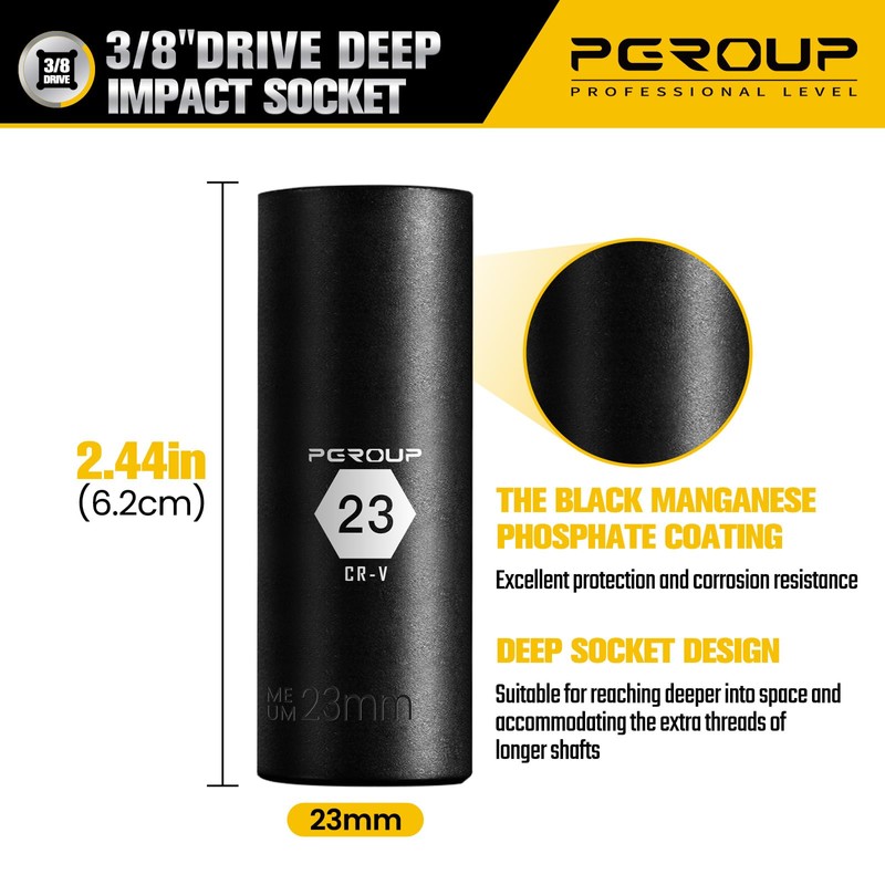 PGROUP 3/8” Drive Deep Impact Socket, Metric(23mm socket), 6-Point, Cr-V Steel With Black Manganese Phosphate Coating