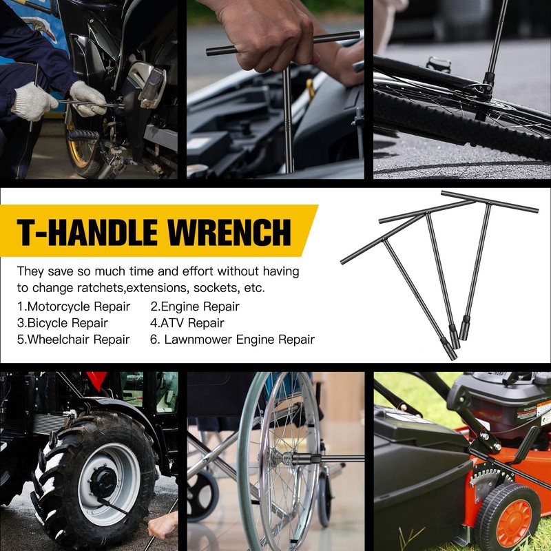 • T-HANDLE SOCKET WRENCH SET: Include 8mm, 10mm, 12mm T- shape deep 6-point socket wrench.They are a set of independently used tools, relatively small and convenient, allowing for easy portability while cycling