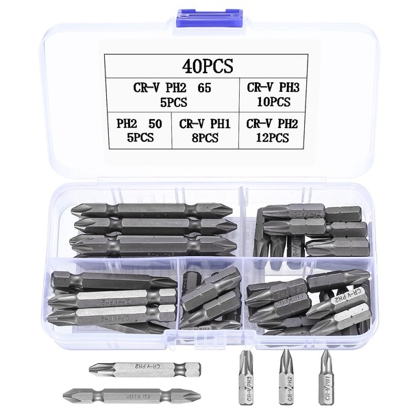 - Package Includes: This set includes 40 pcs PH screwdriver bits (8 pcs CR-V PH1, 12pcs CR-V PH2, 10 pcs CR-V PH3, 5 pcs CR-V PH2 50, 5 pcs CR-V PH2 65), designed for a variety of applications, from electronics to home repairs, providing durability, precision, and convenient storage