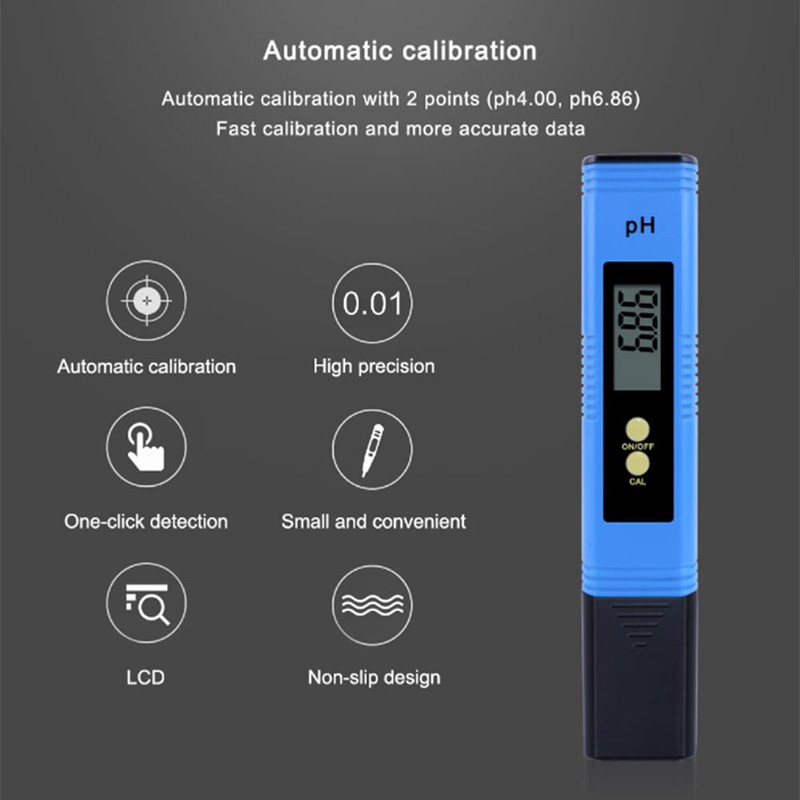 - 【Calibration Ways】This PH tester has two calibration ways. The first one is automatic calibration, which means that this PH tester can adjust according to water temperature and quality automatically, making the PH reading can be obtained quickly. Meanwhile, you can also calibrate the tester with the one-touch button "CAL" by using calibration buffer powder.