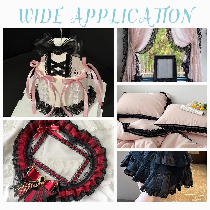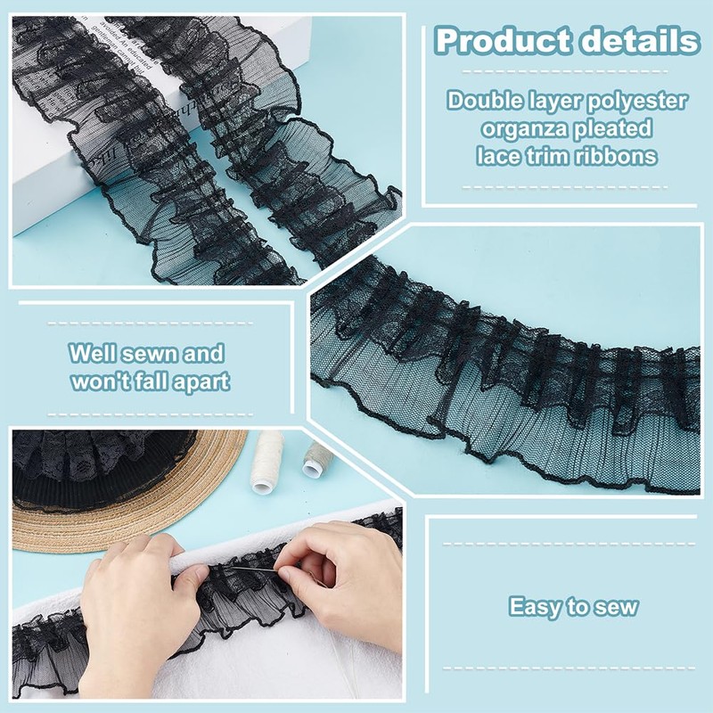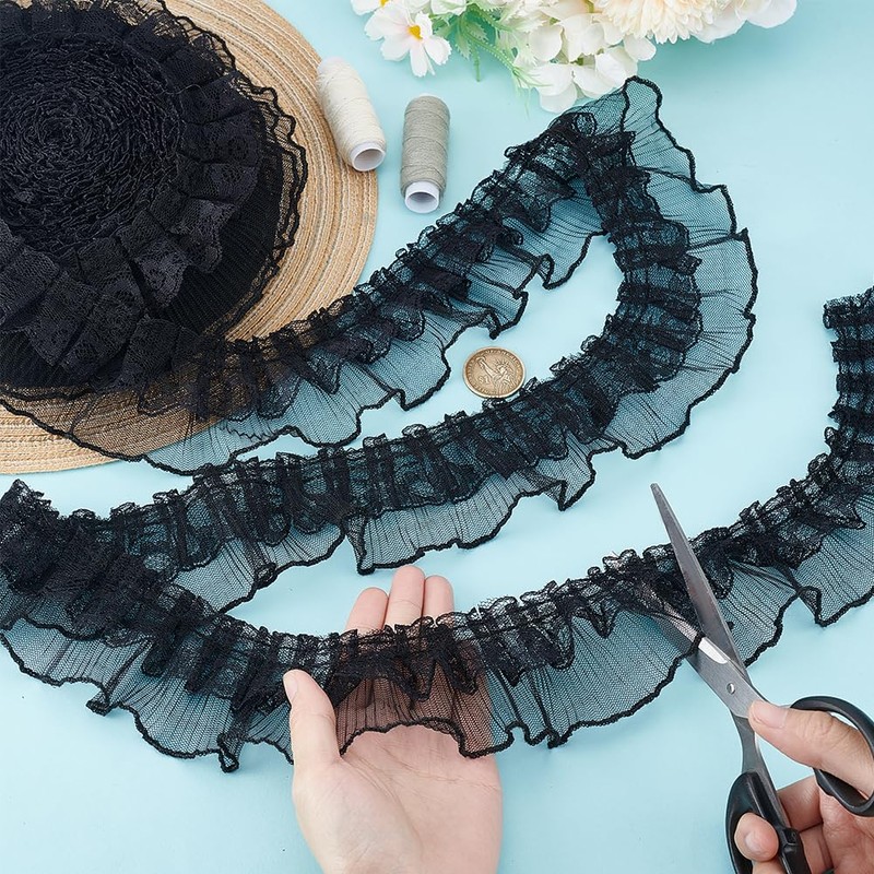 - Double-layer design: this lace ribbon with double-layer design, the black colour of the ruffled lace decoration gives it a mysterious look, the classic and exquisite lace edge trim gives the clothing femininity. Double layers of valances are firmly sewn through the line, don't worry that it will fall off.