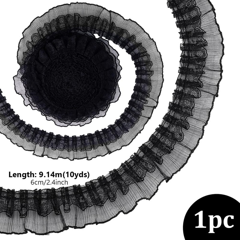 - Package and size: you will receive 1 piece black lace trim ribbon, total 10 metres long, the width of the double layer is approx. 6 cm (2.37 inches). Suitable size and long enough for you to sew a dress, bag, costume collar, sleeves or DIY crafts.