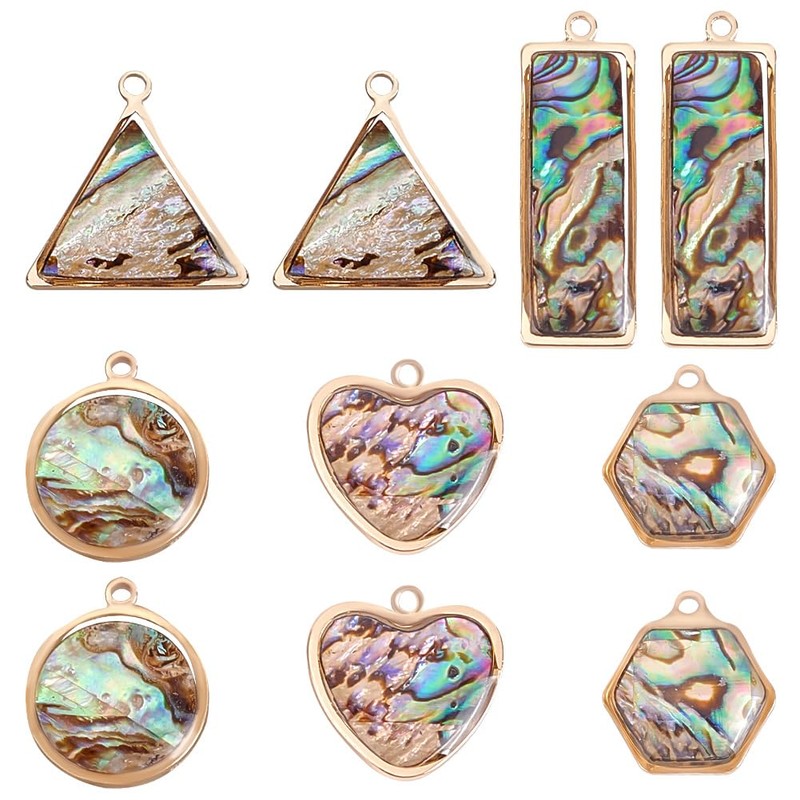 - 5 Styles: These abalone shell pendants in 5 different styles, included heart, flat round, rectangle, triangle, hexagon. The abalone charms shows a bright color, this makes it very unique and eye-catching. Can give you more choice to make jewellery for summer party, flexible to match with your dressing, bring more vitality this summer.