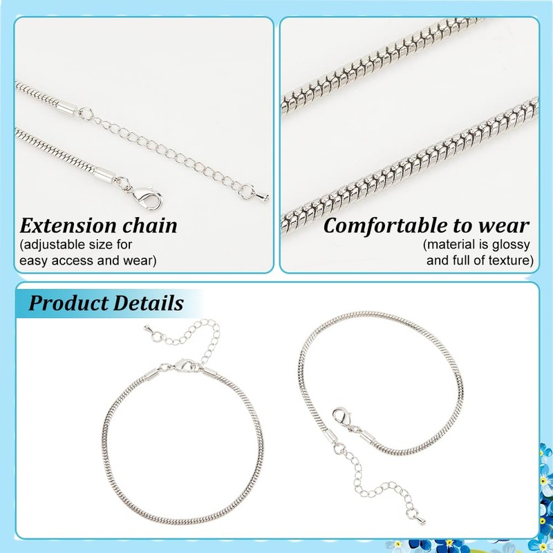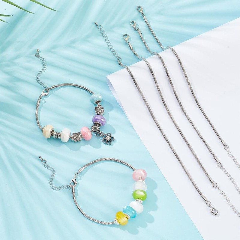 PH PandaHall 19cm Snake Chain Bracelet European Bead Charm Adjustable Bracelet Silver Snake Bracelet Charm Chain Extender with Lobster Clasp for DIY Christmas European Bracelets Making Gift, 10pcs