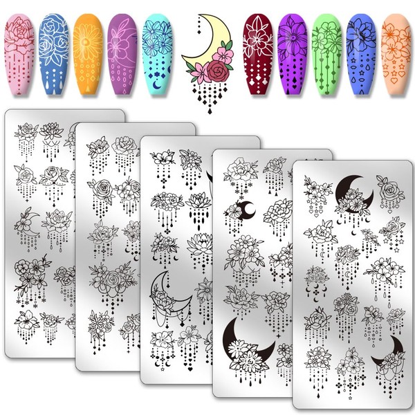 PH PandaHall 5pcs Nail Stamping Plates, Floral Pearl Necklace Nail Art Stamp Template Flower Moon Nail Art Stencils Stainless Steel Nail Picture Plates for DIY Nail Design Print Manicure Salon