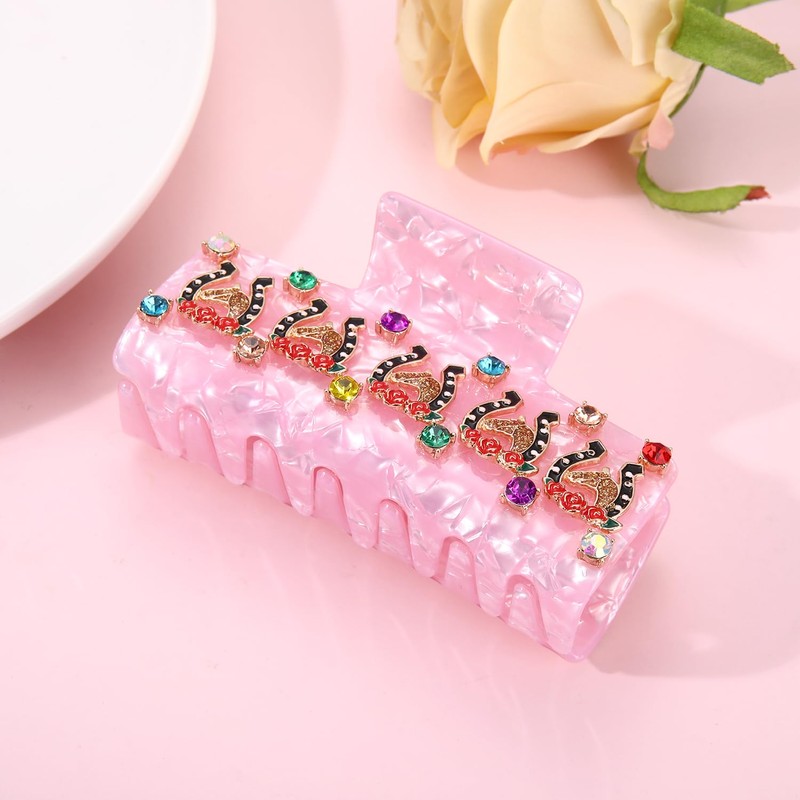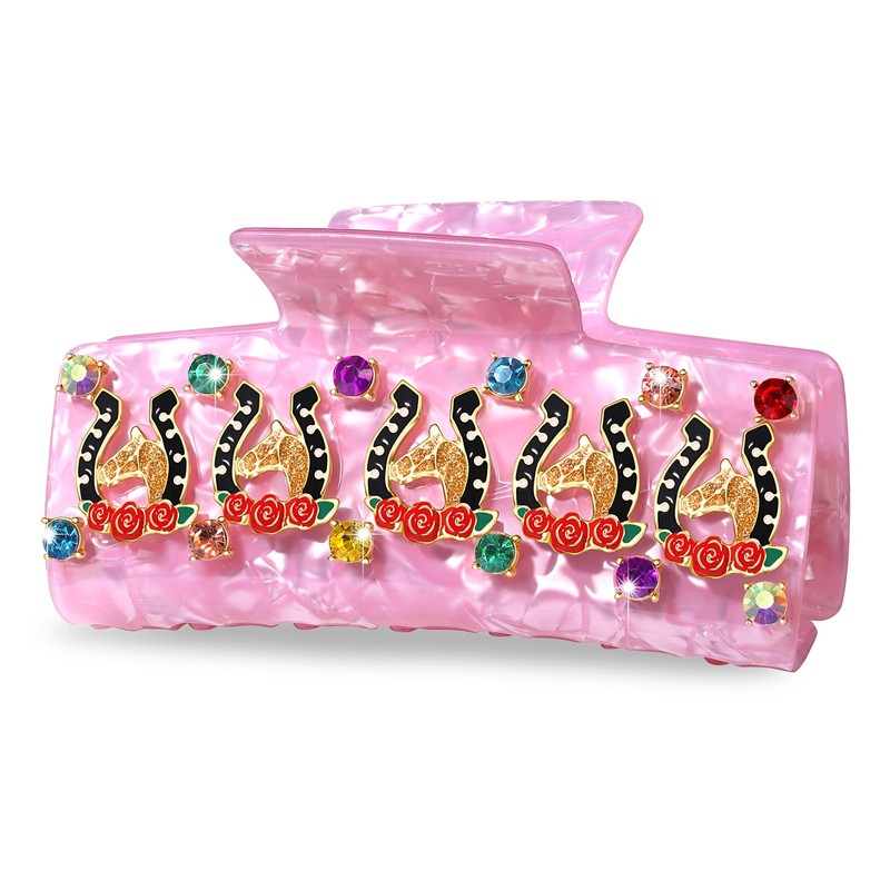 PHALIN Kentucky Derby Hair Claws for Women Horse Horseshoe Rose Hair Claw Clips Large Pink Square Crystal Acetate Hair Clips Kentucky Derby Outfits Accessories Gifts (Pattern E)