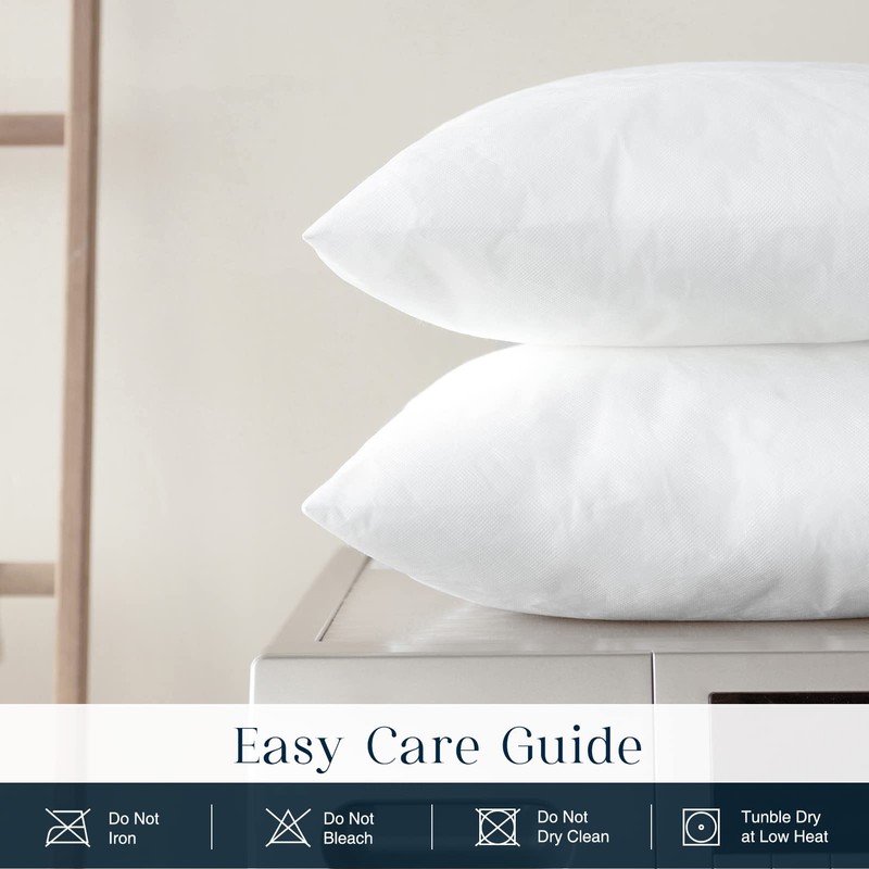 - Vacuum Shipped & Washable - Our pillow inserts are vacuum compressed and sealed for shipping purposes. Steam iron for 1 minute without pressure, or tumble dry on high heat for 20 minutes to quickly restore its fluffiness. All our pillows can be hand washed or lightly washed with a mild detergent.