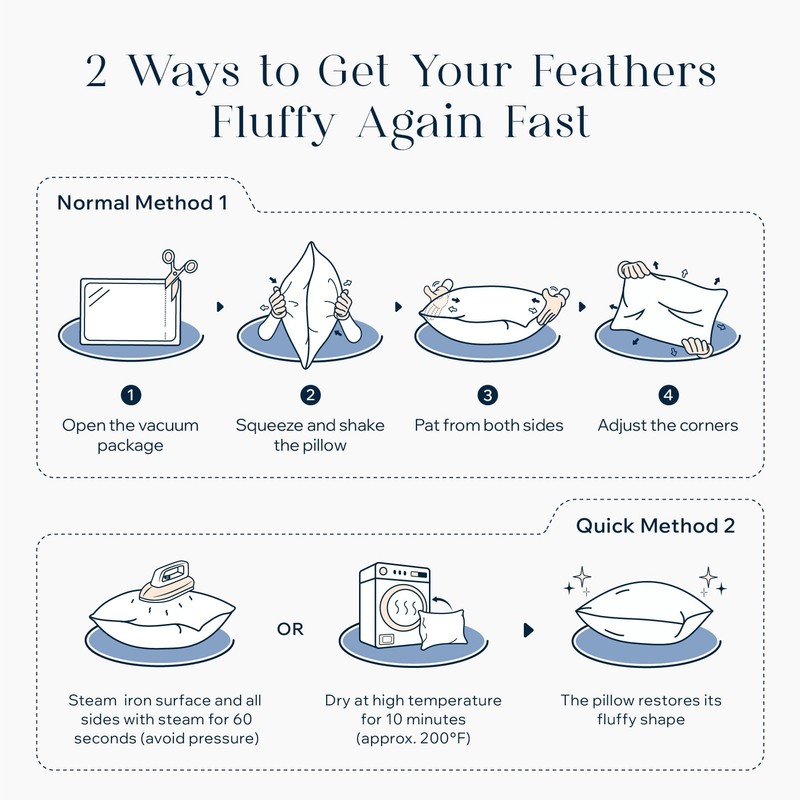 - Vacuum Shipped & Washable - Our pillow inserts are vacuum compressed and sealed for shipping purposes. Steam iron for 1 minute without pressure, or tumble dry on high heat for 20 minutes to quickly restore its fluffiness. All our pillows can be hand washed or lightly washed with a mild detergent.
