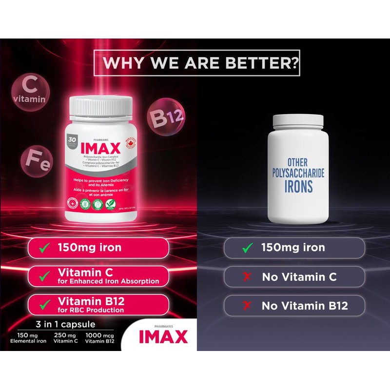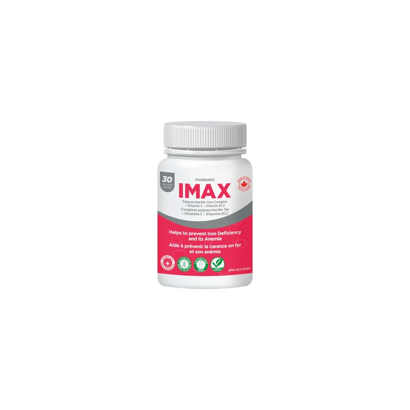- Pharmaris IMAX- Only Polysaccharide Iron brand in Canada with the maximum amount of Vitamin C and B12 dosing in one capsule.