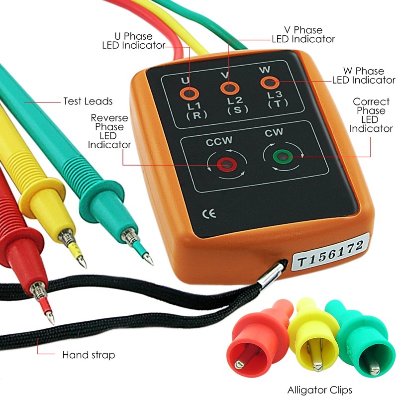 Testing is as easy as connecting the included well insulated alligator clips of the unit to the three phase circuit under test and the unit will indicate the presence of open phase & phase sequence thru the LEDs and buzzer.