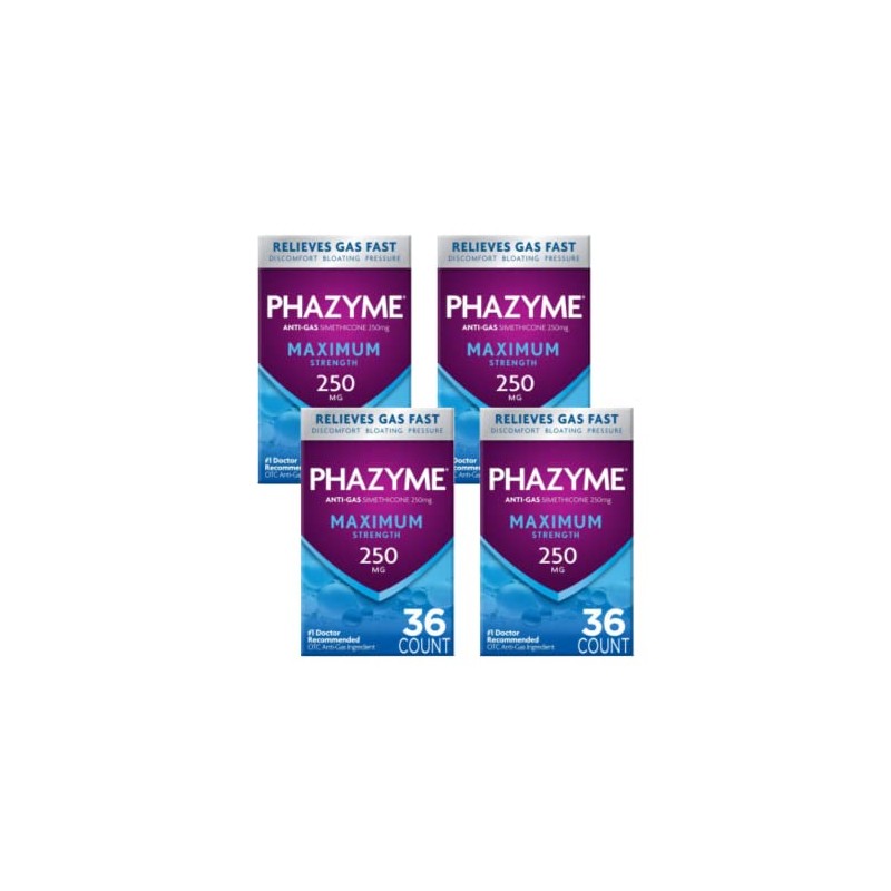 Phazyme Maximum Strength Gas and Bloating Relief | 250 mg Simethicone | 36 Fast GELS | Pack of 4