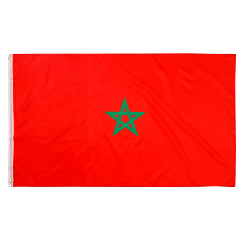 - Product information: Moroccan flag made from 100% polyester with two integrated brass eyelets. Dimensions: 90 x 150 cm. Weight including packaging: approx. 82g