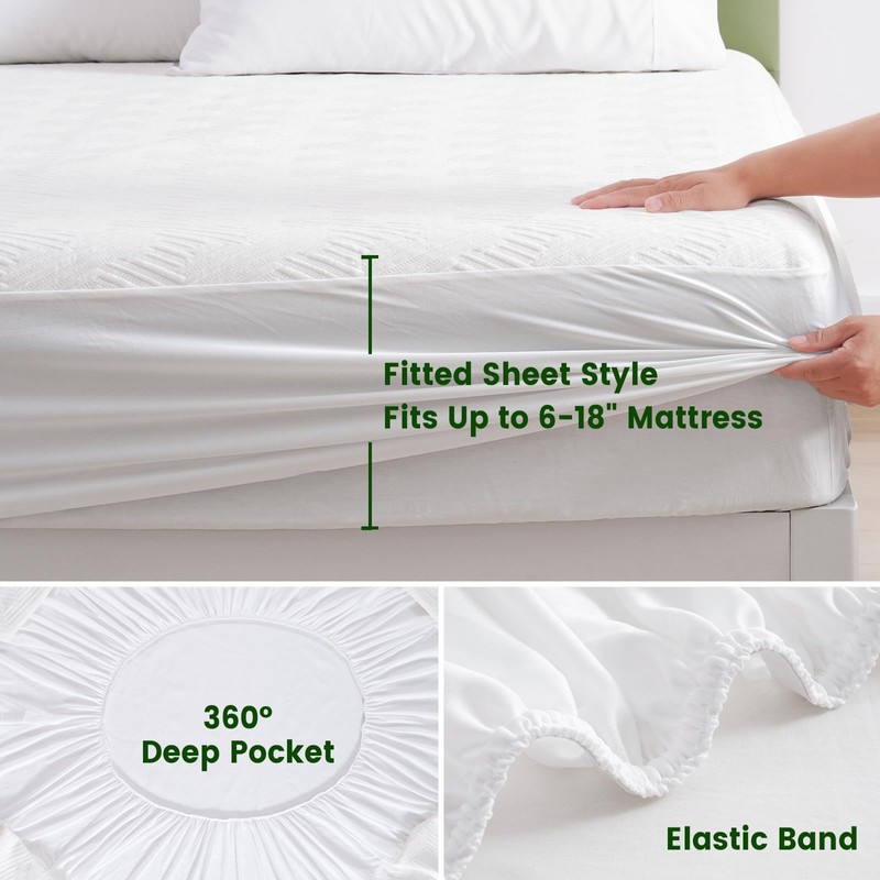 - Deep Pocket & Perfect Fit: Our mattress protectors use fitted sheet design with non-slip elasticated deep pockets that stretch up to 18 inches to fit most mattress, wrapping your mattress tightly in 360°. So that it won't move even if children or pets jump around on it, and protects your mattress from all sides.