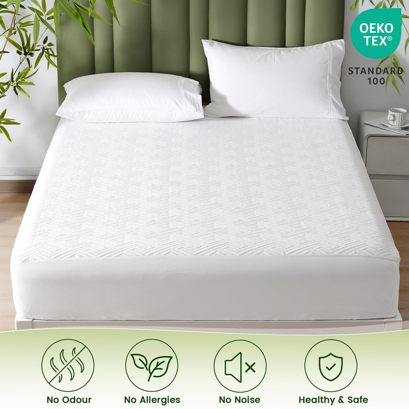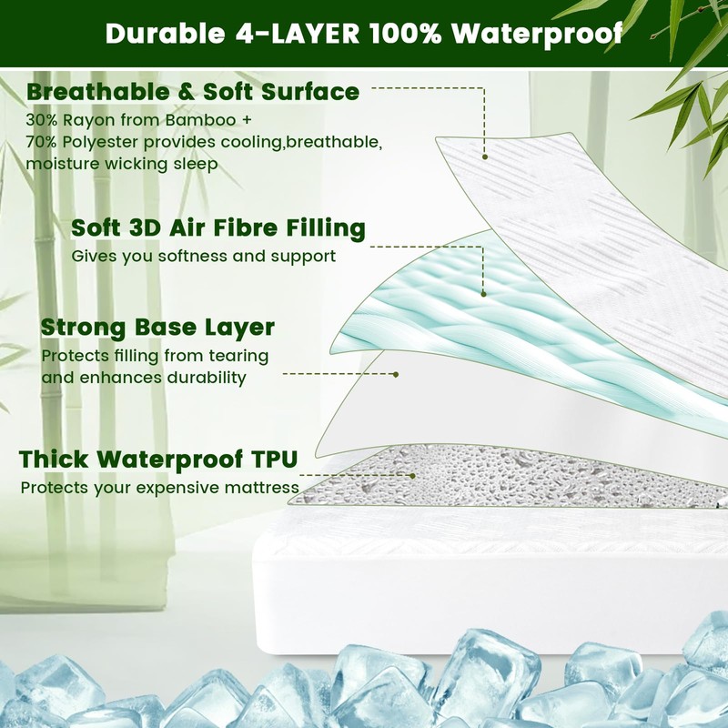 - Breathable and Cooling Surface: The surface is blended with 70% polyester and 30% viscose derived from bamboo fibre, which brings softness and breathability while enhancing the durability and the elasticity of the mattress protector. The natural fabric has unique moisture absorption, which can effectively absorb sweat quickly take away the heat and stuffiness, and keep the mattress dry and cool. Creating a cool and refreshing sleep paradise for you.