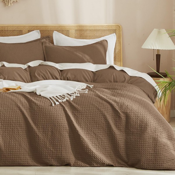 PHF Waffle Weave Duvet Cover Set Queen Size, No Snagging Ultra Soft Luxury Textured Breathable Comforter Cover for All Season 3pcs, Durable Bedding Duvet Set with 2 Pillow Shams, 90"x90", Cocoa Brown