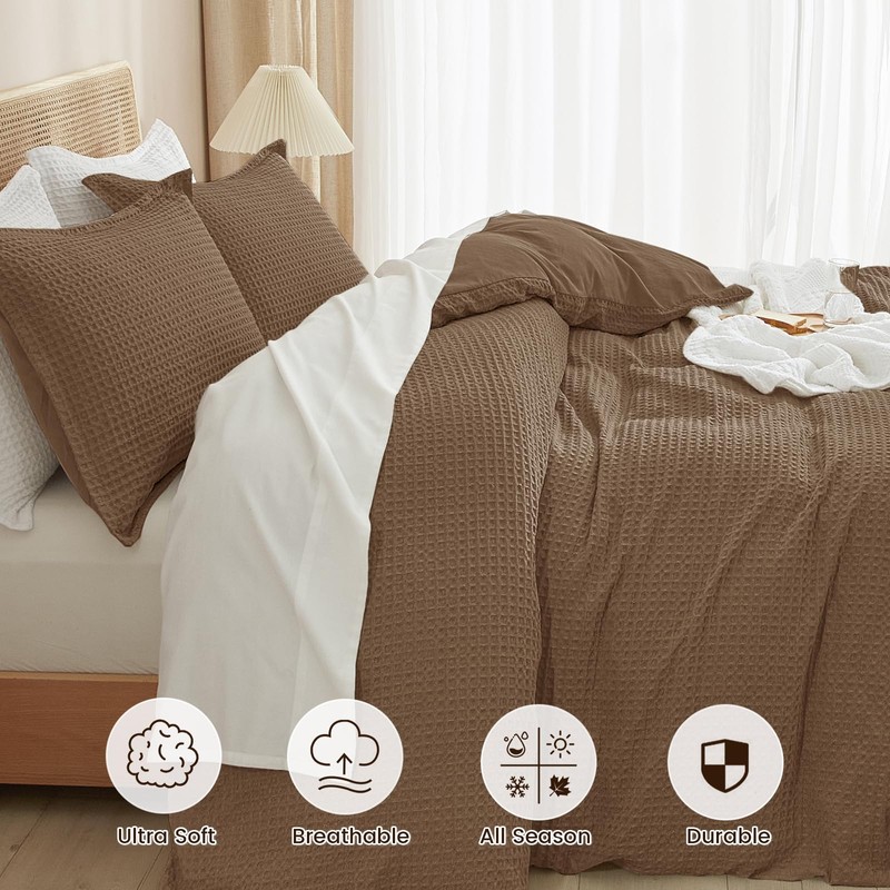 Brushed fabric honeycomb duvet cover sets are super soft and breathable and skin-friendly for all-season comfort. The classic and stylish waffle design is complemented by a delicate and intricate weave for extra sophistication.The 3-piece duvet cover set contains 1 duvet cover and 2 pillow shams.