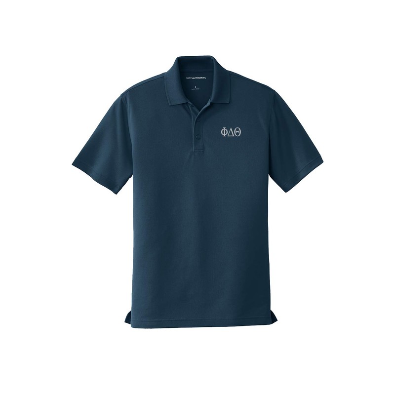 - Performance polo with Phi Delta Theta letters embroidered over the left chest