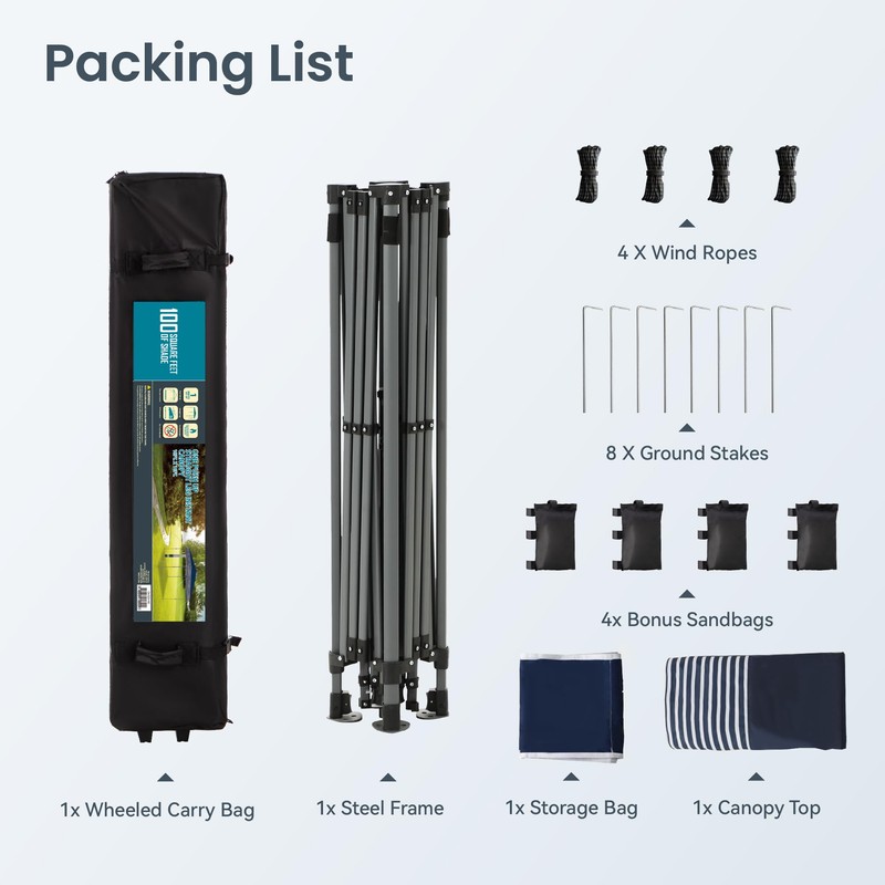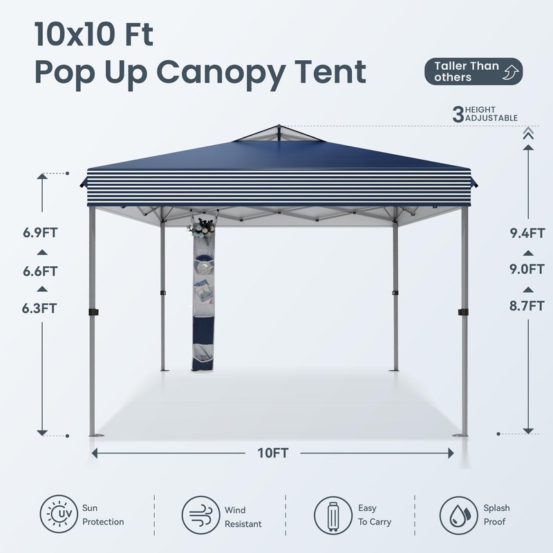 - 【Superior Quality】:The premium 10x10ft pop-up canopy is made of CPAI-84 flame resistant 150D oxford cloth with PU coating, as well as a stainless steel frame. The improved fabric is UV coated to reflect 99% of harmful sun rays and is water-resistant.