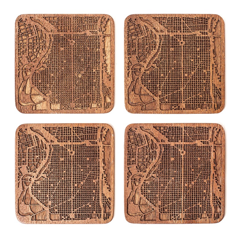 Philadelphia Map Coaster, Set of 4, Sapele Wooden Coaster with City Map, Handmade
