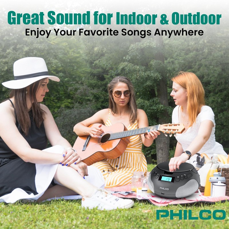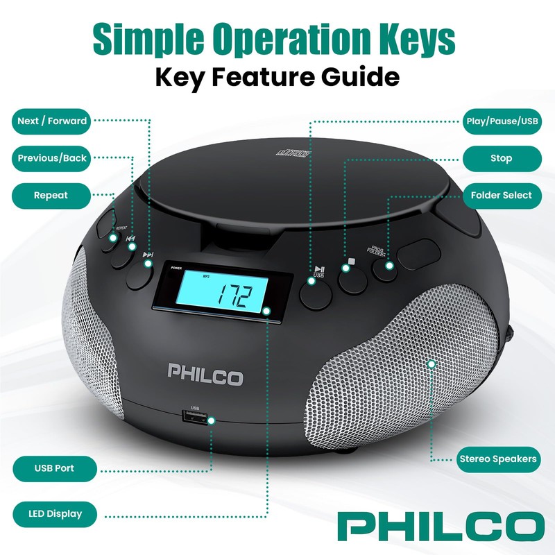 Philco Portable CD Player Boombox, FM Radio CD Players for Home, Compatible with MP3/WMA/CD-R/CD-RW 3.5mm Aux Input |USB Port | Stereo Sound |AC/Battery Powered |LED Display