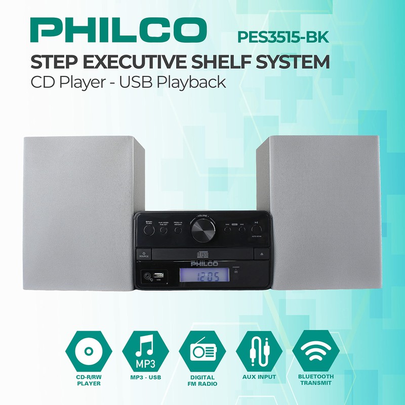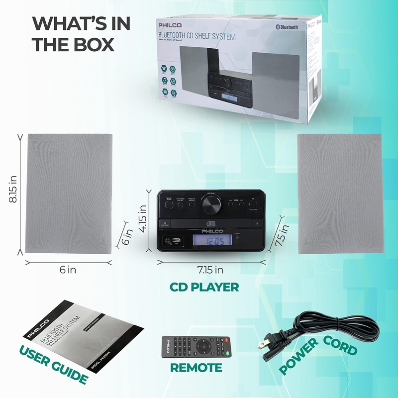Philco Stereo Shelf Systems Tray Loading CD Player with Digital FM Radio, Bluetooth Streaming, Remote Control in Silver | LCD Display | 3.5mm Headphone Jack | MP3 & AUX Port Compatible | USB Input