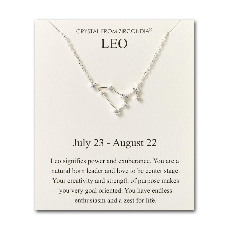 - Made with Trust. Leo Star Sign Zodiac Constellation Necklace and Quote Card with Zircondia Crystals by Philip Jones. Buy with confidence with our 12-month manufacturer warranty and 30-day money back guarantee if you are not 100% happy with your Necklace.