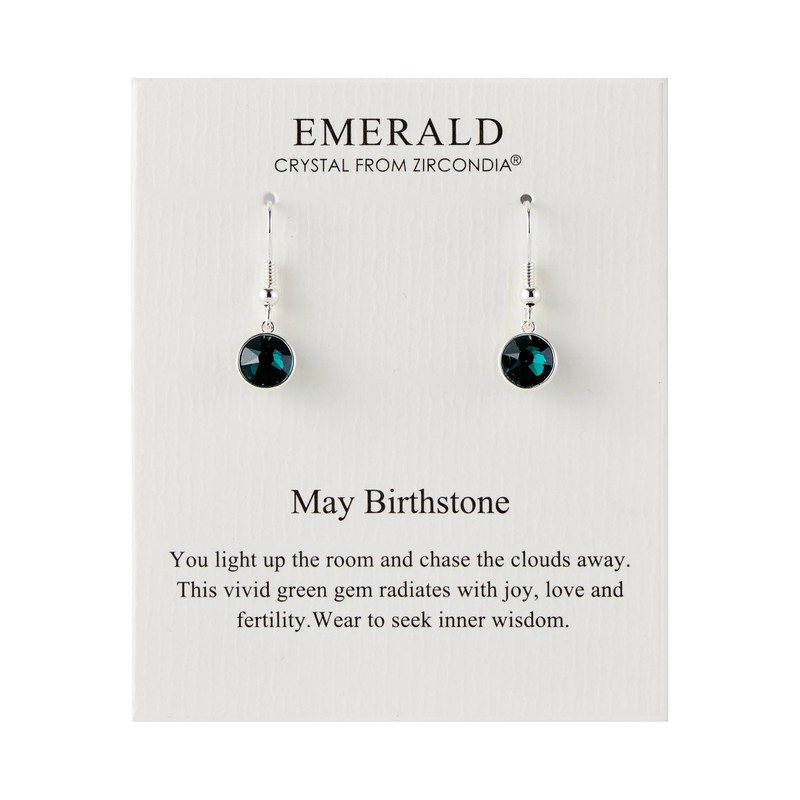 - Made with Trust. May Birthstone Drop Earrings Created with Emerald Zircondia Crystals by Philip Jones. Buy with confidence with our 12-month manufacturer warranty and 30-day money back guarantee if you are not 100% happy with your Earrings.