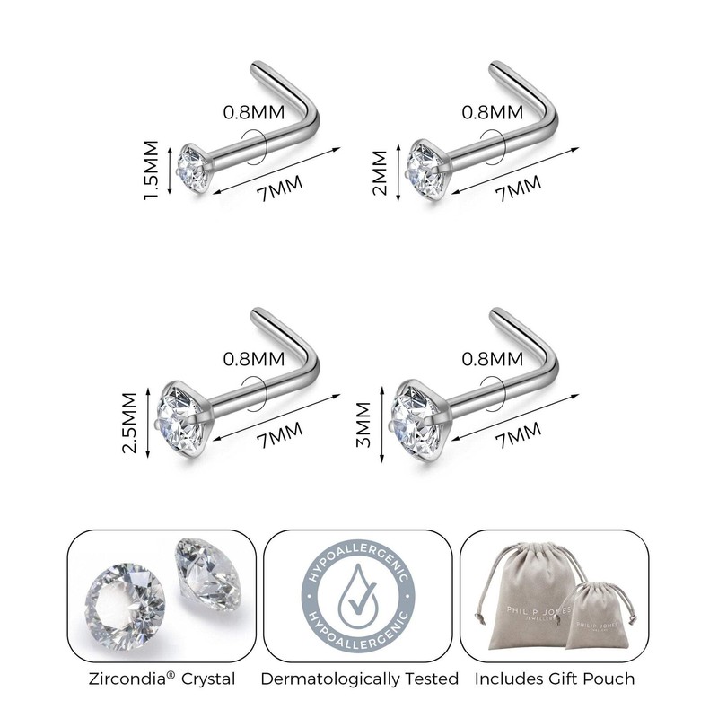 - Hergestellt mit Vertrauen. 4 Stück L-förmige Nasenstecker aus Edelstahl mit Zirkonia-Kristallen von Philip Jones. Kaufen Sie mit Vertrauen mit unserer 12-monatigen Herstellergarantie und 30-Tage-Geld-zurück-Garantie, wenn Sie mit Ihren Ohrringen nicht 100% zufrieden sind.