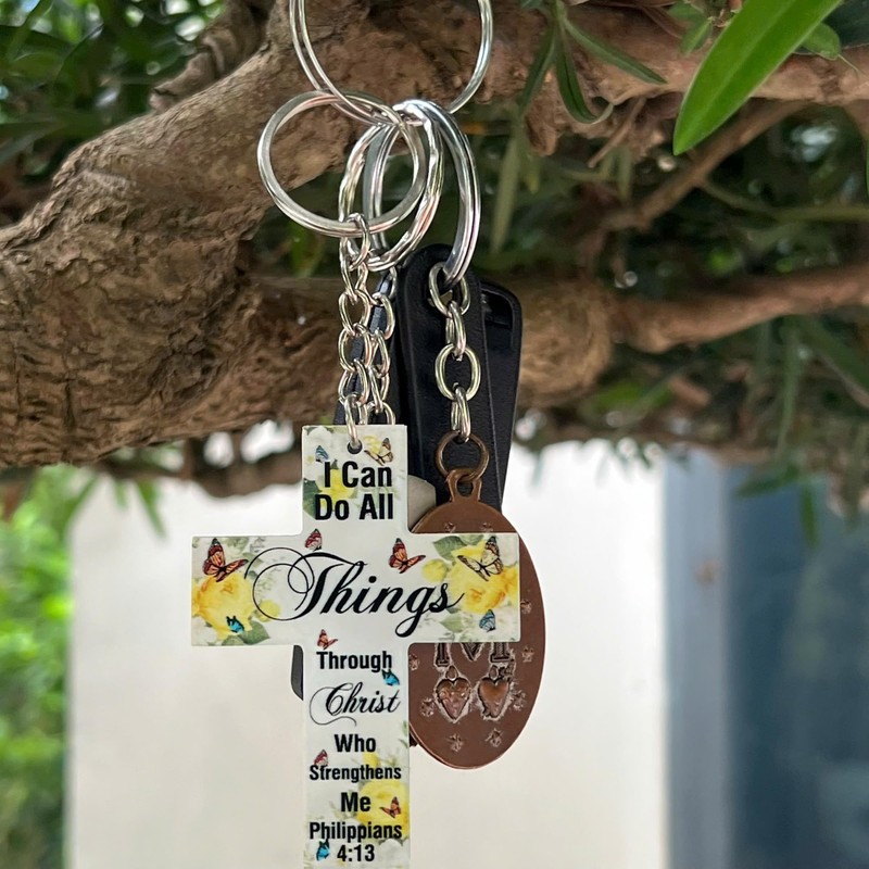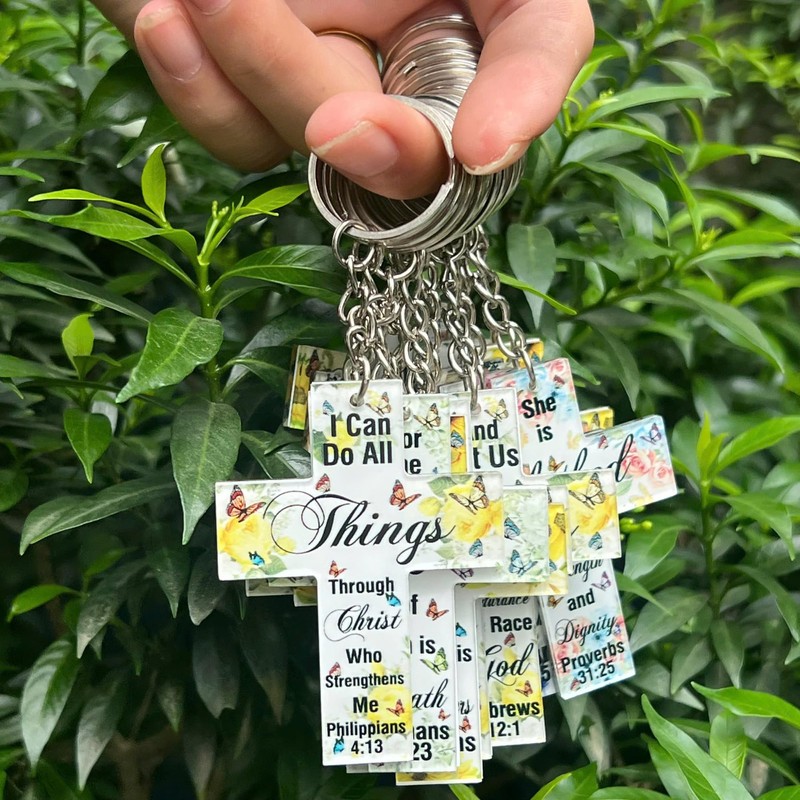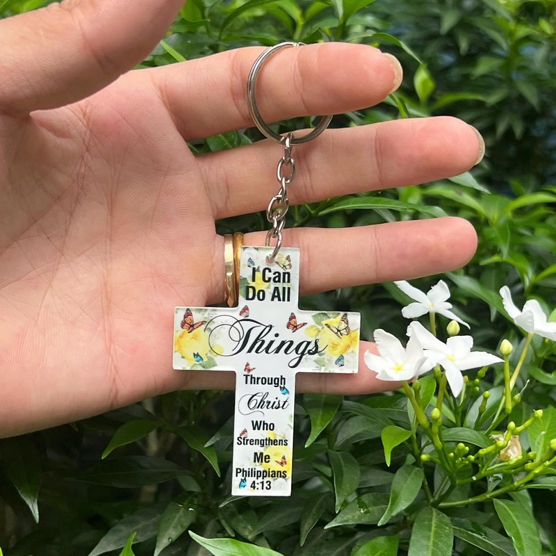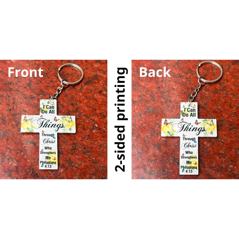 - INSPIRATIONAL DESIGN: Cross-shaped keychain featuring Philippians 4:13 Bible verse with beautiful butterfly motif, printed on both sides for lasting inspiration