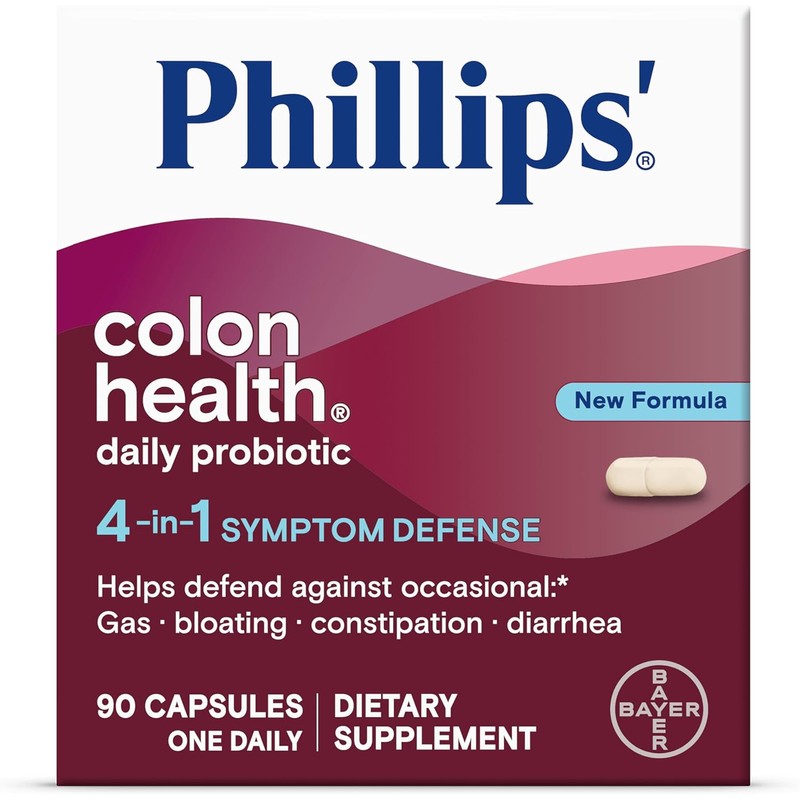 Phillips' Colon Health Daily Probiotic Capsules, 4-in-1 Symptom Defense to Help Defend Against Occasional Gas, Bloating, Constipation, and Diarrhea, Daily Supplement, 90 Count
