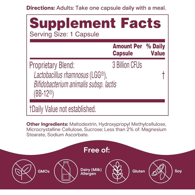 - Contains Specially Selected Probiotics: Lactobacillus rhamnosus (LGG) and Bifidobacterium (BB-12). Non-GMO; Gluten Free; Dairy Free and Soy Free. No refrigeration required