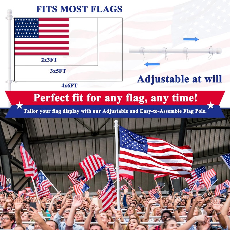 - ADJUSTABLE & RORATING FREELY - The flag pole is assembled from multiple parts. The 4-section flagpole can be freely combined. The flag pole rings/clips can rotate 360 freely to prevent the flag from getting wrapped around the pole.