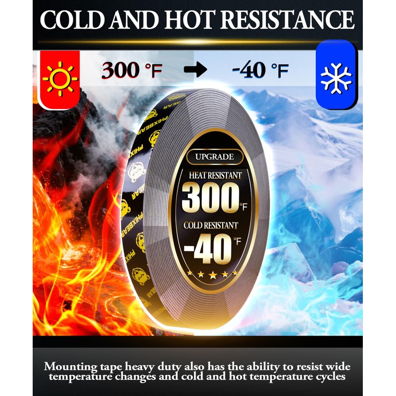 - 【Super High Temperature Resistance】 Heavy duty double sided mounting tape has excellent temperature resistance, capable of with standing high temperatures up to 300 ℉ (149 ℃) and low temperatures down to -40℉ (-40 ℃) in the short term and maintaining good adhesion at 199 ℉ (93 ℃) in the long term, allowing it to perform excellently in both indoor and outdoor environments. In addition, mounting tape heavy duty also has the ability to resist wide temperature changes and cold and hot temperature cycles, making it an ideal choice for various indoor and outdoor applications.