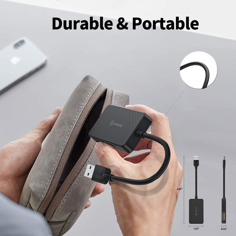 • Short cable and easy to carry: This USB SD card adapter measures 73 x 42.5 x 14 mm. You can easily carry it in your bag or pocket when travelling or at work. The cable can withstand multiple bends. Designed with a cable so it won't block your other ports.