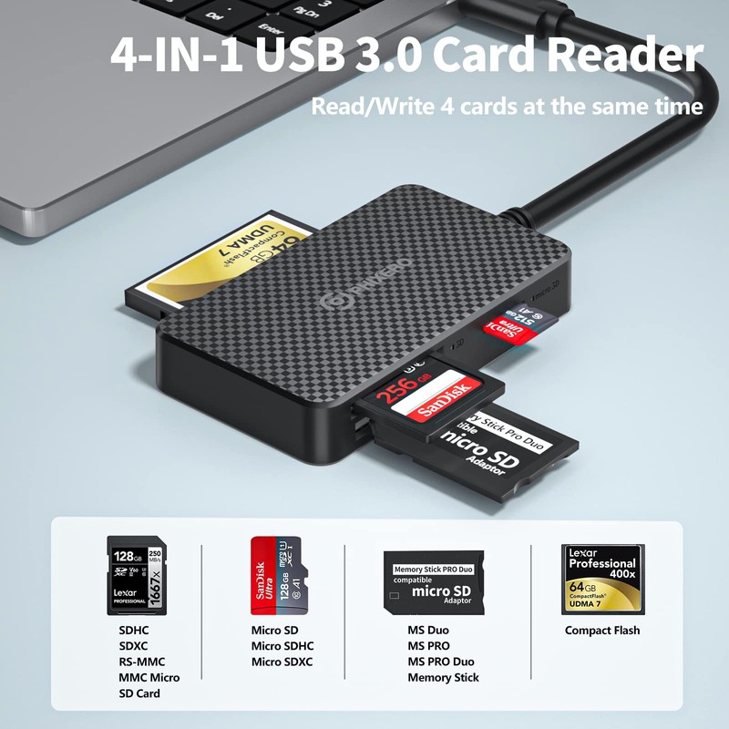• 4 in 1: 4 cards read and write at the same time, eliminating constant plugging and unplugging The USB Card Reader 3.0 supports SD, Micro SD, CF cards and memory sticks. Card reader USB 3.0 external supports bi-directional transmission. Make your work easier.