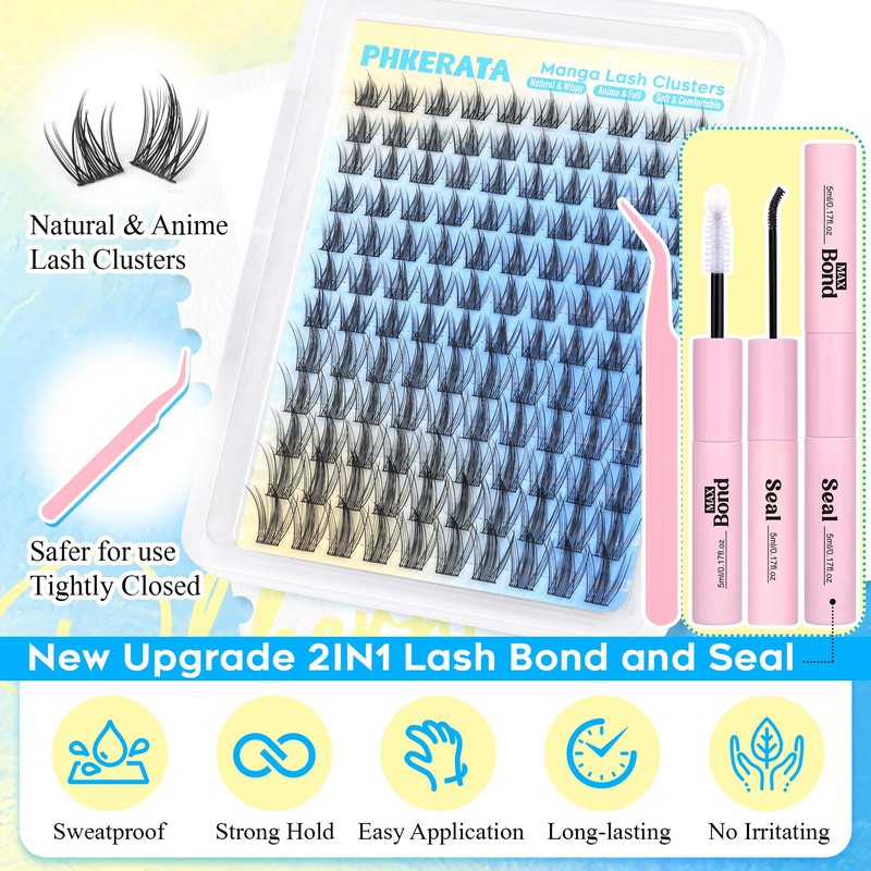 - All-in-One Lash Clusters Kit: This eyelash extension kit has everything you need: the manga lash clusters, lash bond and seal, and precision tweezers. Eyelash tweezers make placing natural clusters easy, while the lash cluster glue ensures a secure, comfortable hold all day