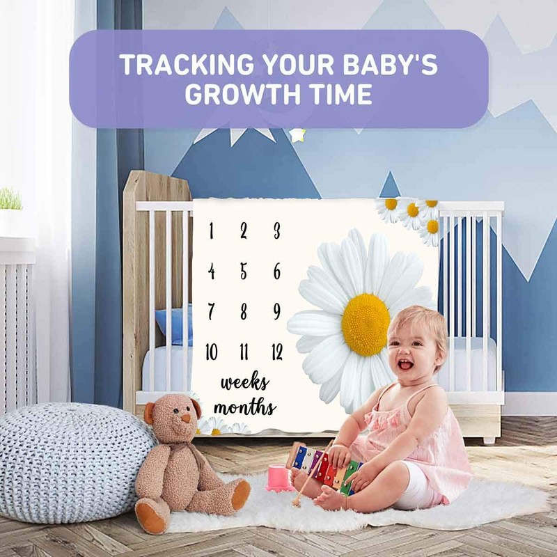 PHMOJEN Baby Monthly Milestone Blanket, Daisy Big White Blanket for Nursery, Unisex for Newborn 1-12 Months, Includes 4 Frame and 1 Headband 47"x47" BTLSPH383