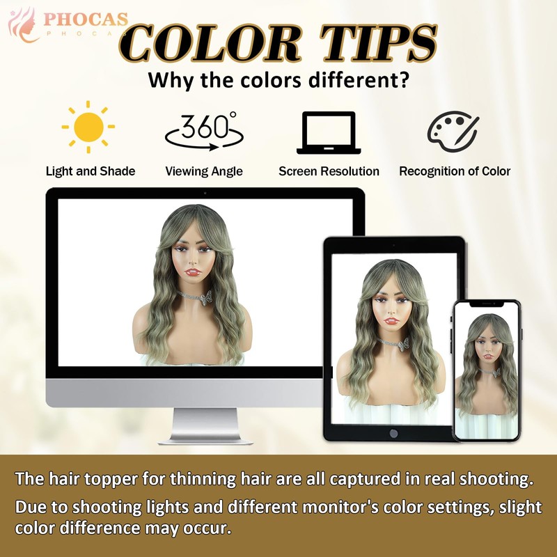 - Get a Charming Look Easily: PHOCAS hair toppers for women are super easy to wear and take off, allowing you to change your appearance and become more fashionable and charming in just a few seconds. It is no glue, no sewing, no wig cap, just open the 5 anti-slip clips and apply to your head.