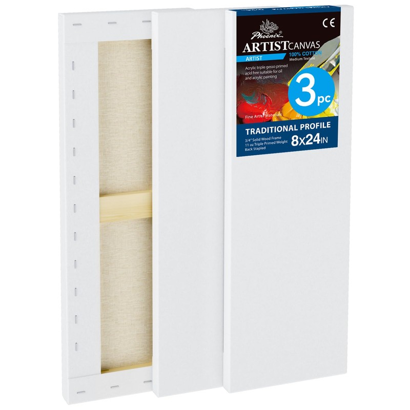 PHOENIX 8x24 Inch 3 Pack Artist Canvas - Long Skinny Stretched Canvases for Painting - 3/4 Inch Profile, 100% Cotton 11 Oz. Gesso Primed White Blank Professional Canvas Oil & Acrylic Paints