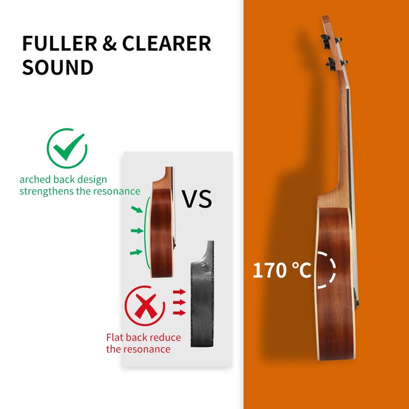 - Well Made: Smooth mahogany body and rosewood fretboard for comfortable playability and durability. The acoustic Concert ukulele 170°Arched Back gives a longer sustain, fuller, warmer and a bit deeper woody tones sound that are a pleasure to listen to