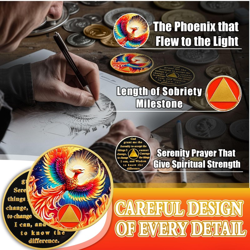 - Flying to the Light: This sobriety chip combines the symbolism of the phoenix and the flame, blending rebirth and growth in sobriety. Designed and created specifically for Alcoholics Anonymous, Phoenix Sobriety Coins will inspire us to move forward into a new life of sobriety. This AA coin also provides us with daily spiritual support as well as commemorations and celebrations of sobriety milestones