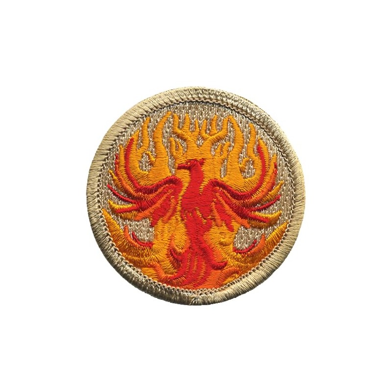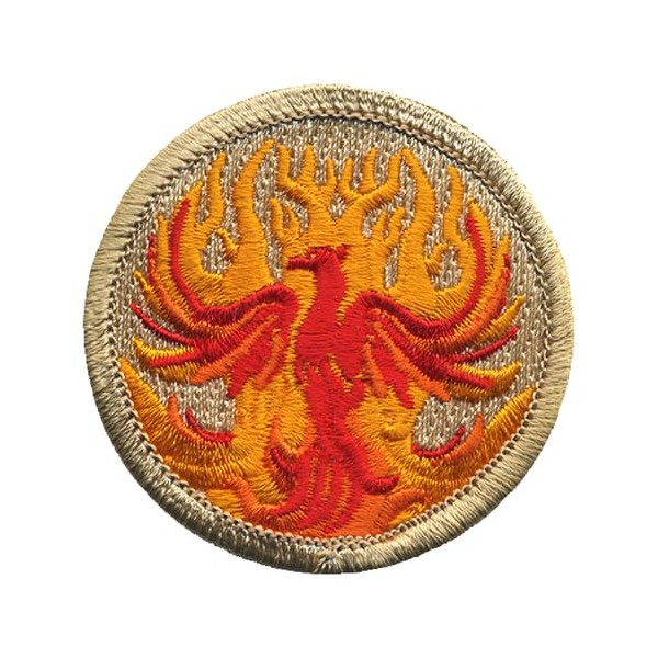 Rising from the ashes, this patrol patch has a bird with flames shooting from it engulfing its feathers. The flames are a mix of yellow and orange with a red bird, all against a standard khaki background. Alt