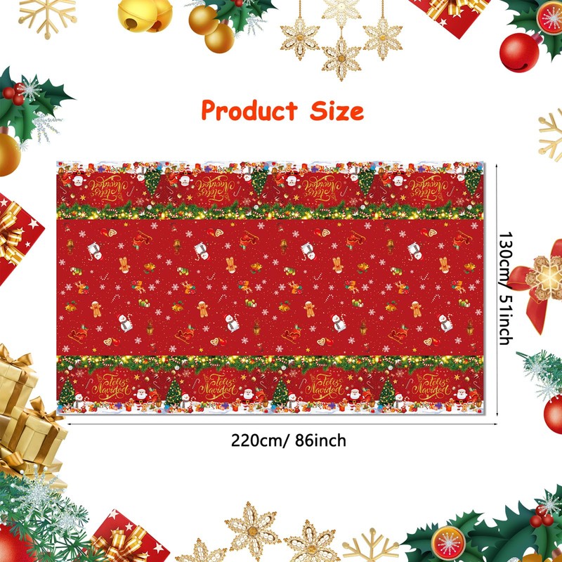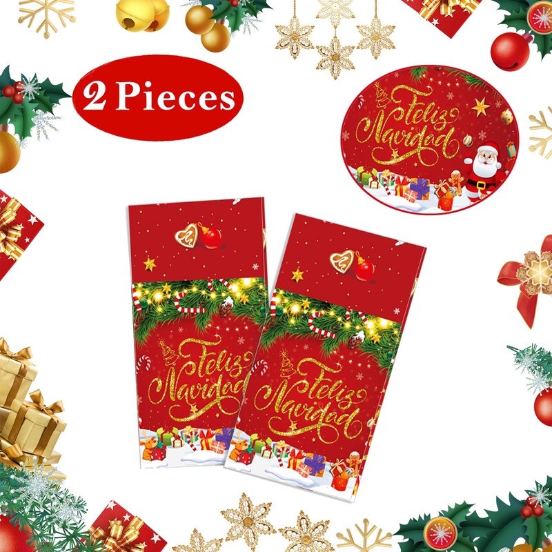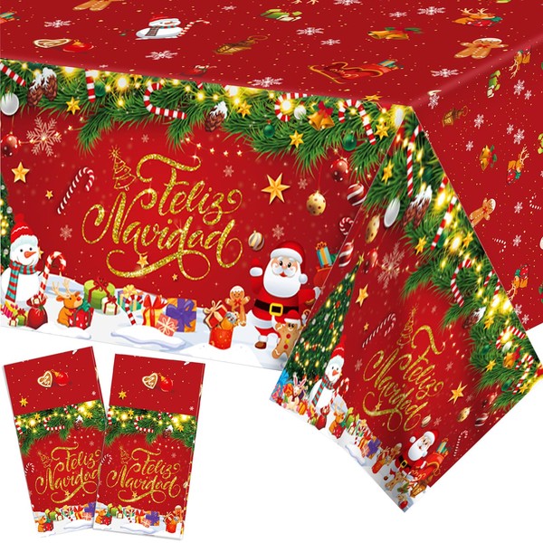 - WHAT YOU WILL GET: You will receive 2 pack Christmas Feliz Navidad tablecloths with novel designed Christmas themed elements with Feliz Navidad phrase, Santa Clus, snowmen, Christmas trees. The size is 51" x 86" (130 x 220 cm), which fits most rectangular tables. The Christmas table cloths disposable will work perfect for your table setting, help you to make your party more interesting and attractive. Our Christmas table cloth designs are brightly colored and cute, everyone will love it!